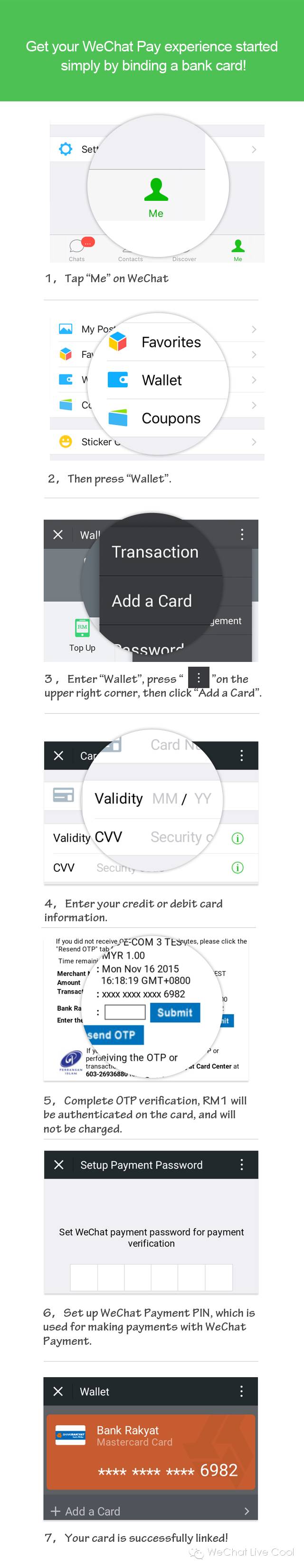 Tap "Me" on WeChat > Click on "Wallet" > "Cards" > “Add a Card” then follow the instructions below: