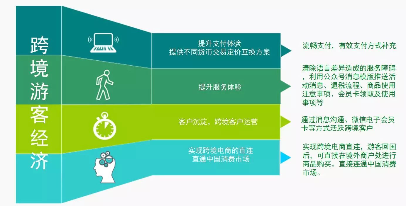 微信开放跨境支付,不仅便捷了支付流程,商户还可以通过微信公众号推送向旅客优惠信息、退税流程、使用事项、会员卡等,旅客回国后仍然可以通过公众号购买商品。如此一来,海外商户便能够实现跨境电商直连,直通中国消费市场。