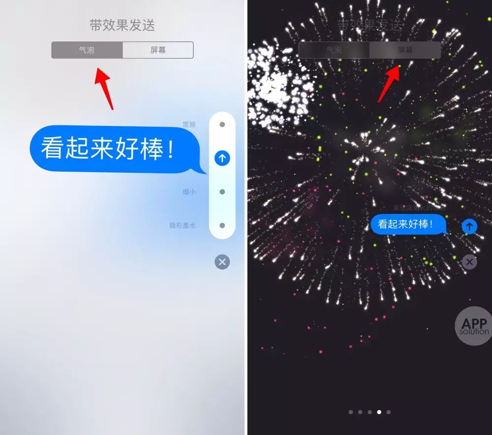 4 种气泡特效分别是:震撼、放大、缩小和隐形墨水,支持文字和图片。震撼:你的消息会很有力地甩在屏幕上,一般用于情绪激动的表达;放大与缩小:你的消息会先以大(小)字显示,然后恢复到正常状态。一般来说,表达大(小)声说的意思;隐形墨水:这是最有意思的一种。你的消息会被蒙上很华丽的涂层,需要用手指抹开才能看到消息内容。很适合用来发确定旁边没人才能看的消息。