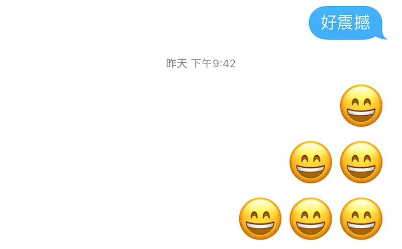 TapBack: 如果你想对某个人的某次发言快速做出回应(表态),你可以双击(或长按)一条信息,会看到爱心、赞、踩、哈哈、感叹、疑问六个快速选项。很适合用在不知道说什么的时候……这个功能有点类似 Slack 的 reaction(回应),不过 Slack 可以让你任意表情作为回应,比 iMessage 更丰富一些。另外还有两个 Emoji 相关的功能: