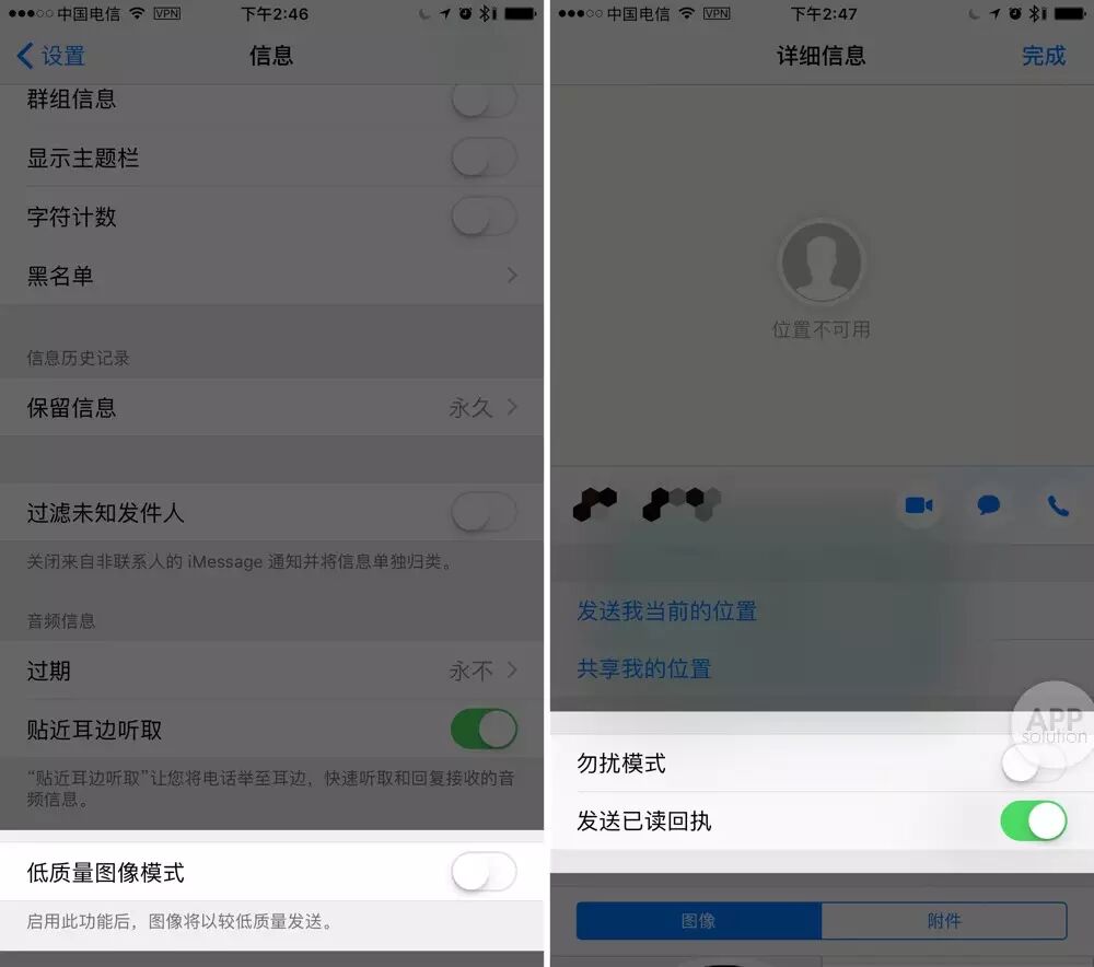 iMessage 此前有一大槽点是照片发送速度太慢,因为传的都是原图。现在你可以开启「低质量图像模式」(在「设置 - 信息」),可以提升图片发送速度,但图片质量也大大降低到了不太能接受的程度……这里推荐一个叫 Pico 的 iMessage 应用,它可以让你自由定义照片的压缩质量,再发送给朋友。在 iOS 10,你终于可以给单个好友设置「发送已读回执」开关了,点击对话窗口右上角的感叹号即可。在 iOS 9 及之前,这个功能只有一个总开关。