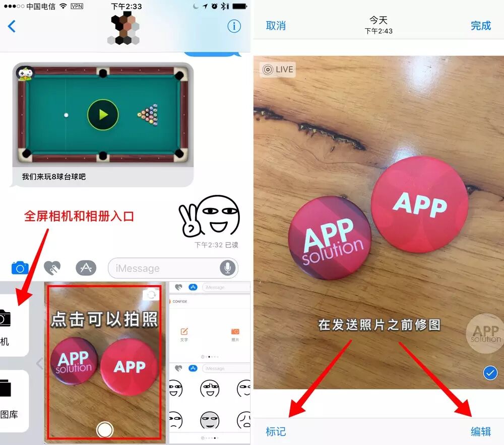 我们还在评测 iMessage 的过程中发现了一些小细节,值得你留意一下。当你在 iMessage 点击相机图标时,你会看到一个可以快速拍照和选择最近图片的窗口。而如果你将取景框向右滑动,可以看到一个隐藏的相机和照片图库入口,点击它们你可以得到完整的全屏相机和照片图库。在 iMessage 发送一张照片之前,你还可以快速对它做编辑或者标记。点击照片缩略图进入全屏查看模式,你会在照片底部看到「编辑」和「标记」两个选项。点击后你可以使用跟相册完全一致的「编辑」和「标记」功能,包括裁剪、加滤镜、添加文字、放大镜效果等等……