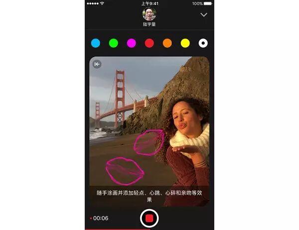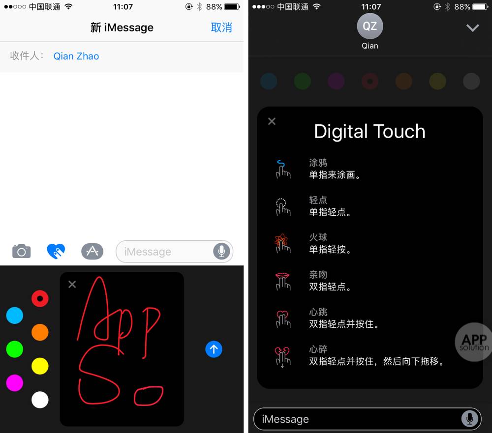 你写字的过程都会被录制下来,并让消息接收方看到。非常暖心的细节。苹果也把 Apple Watch 上的 Digital Touch 功能搬到了 iMessage 上,你可以点击输入框左侧的第二个按钮来启用它。这个功能让你发出各种手写涂鸦、嘴唇、心跳等动画效果的图像和视频。点击手型标记即可看到操作提示(下图),不同操作对应不同效果。涂鸦颜色,既可在一开始选定,也可在中途随时更换。对小视频或图片进行涂鸦也很有趣。