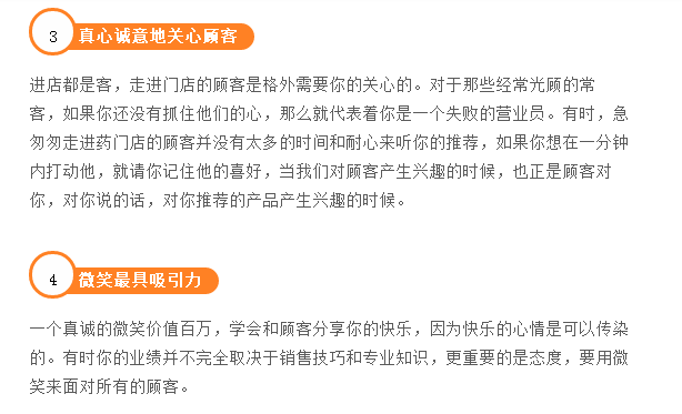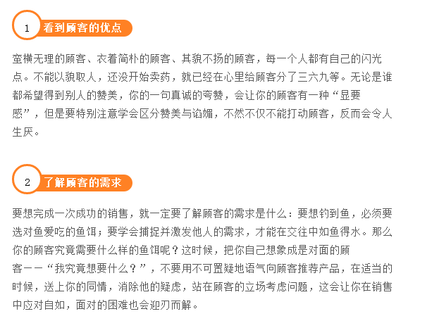 要想得到顾客的认可,就要用真诚与友善的心来打动他们。要掌握自己的情绪,一个好的情绪会为我们赢得顾客的信赖。要懂得一滴蜂蜜比一加仑胆汁更能吸引人。友善地对待你的顾客,才能使对方“心甘情愿”地购买你推荐的产品。