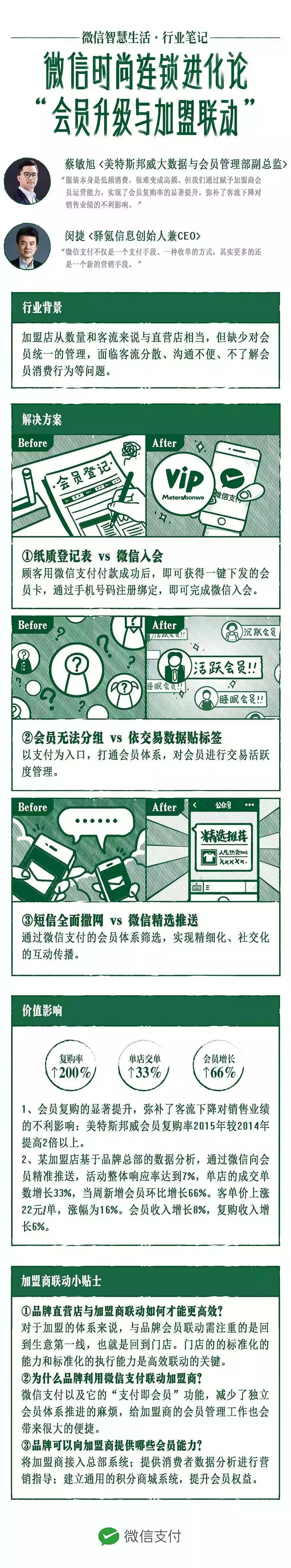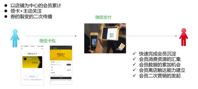 其实,微信“支付+会员”早已推出。以微信支付为入口,直营店和加盟商都可以在支付这一个本来就要发生的动作中,一键完成顾客到会员的转化,将门槛降到最低。为后续精准地发起二次营销打下基础,进一步将粉丝转化为商业业绩。