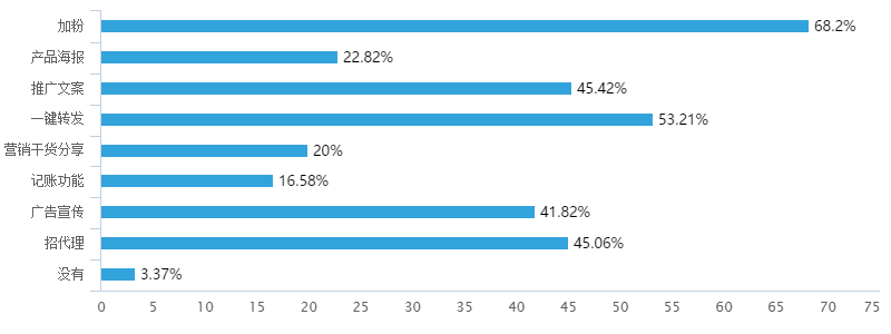 对于微商软件最想要的功能分别是加粉、一键转发、招代理、广告宣传、推广文案,说明微商加粉引流是其核心难点,其次是营销方法,微商希望通过微商软件来帮助解决实际问题。