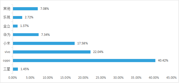 由图6.3看出OPPO R9m以6.81%的比例占据安卓机型的使用榜首,其次是OPPO R9s占比4.99%,vivo X7占比为3.94%。在排名前10位的机型中,有8个OPPO型号手机。前20个机型在微商使用手机机型中的接近五成,而这些手机基本都是2016年发布的新款型号,微商对手机的使用性能要求比较高。