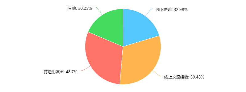 50.48%的微商获得过团队的经验传导,48.7%的微商得到过打造朋友圈的培训,32.98%的朋友有线下培训经历,微商团队的培训体系还不完善,初初建立在经验分享为主,欠缺营销营销知识体系。