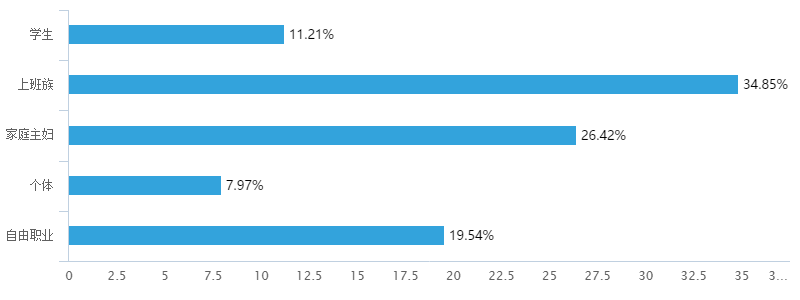 微商群体的职业比较集中,学生,上班族,家庭主妇,自由职业者是比例较多的四类职业,其中上班族兼职做微商的群体占比高达34.85%,上班族一般是固定工资,时间富余的情况下,大都希望通过微商来实现增收。