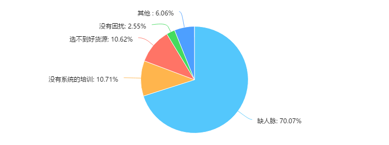 70.07%的微商遇到的最大问题就是客户拓展,即缺人脉,70.07%的微商没有掌握引流加粉的方法,是他们还没有理解粉丝精准性的真相,这部分人缺乏的不是技巧而是思维模式;10.71%的微商遇到最大的困扰是没有系统的培训,这部分微商渴望学习到微商营销知识;10.62%的微商表示选不到好货源,微商的优质商品会靠着口碑建立起销路,逐渐打开市场,这样,微商会走向良性发展之路,“优品驱逐劣品”。