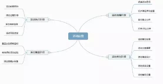 活动策划的流程大都相同或者相似的,它包括前期的准备阶段,主要是内外部分析和目标的初步确立;接着进入策划阶段,主要是创意的凝练和文案的撰写;然后到了实际执行阶段,就要做好活动上线前的预热以及上线后的引导追踪工作;最后一个阶段,是活动全部结束时的总结复盘以及后续报道。具体流程如下图所示: