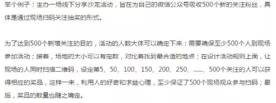 相同的道理,把微信公众号当成具体的一个品牌或者产品去运营,把目标受众群体当成潜在的消费者,“关注”即相当于“购买”。商品可以通过各类优惠活动促成新的消费,那么,公众号自然也可以通过各类活动吸引新的关注。